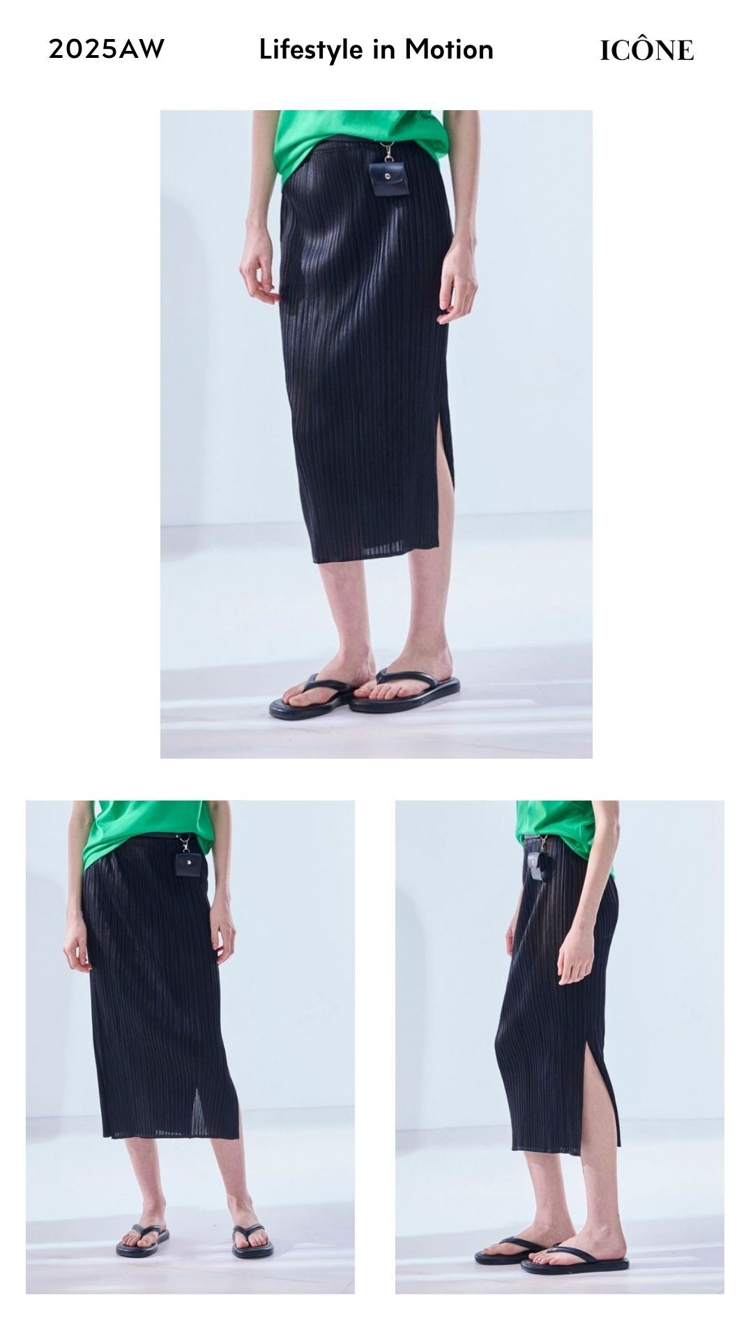 *直紋布料搭配細緻壓褶設計,讓整體輪廓更加修長有型