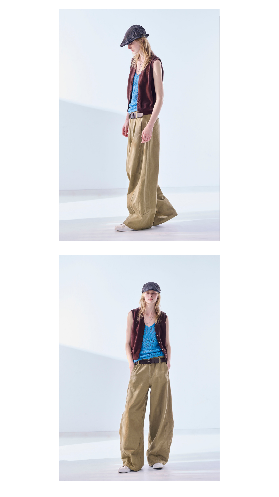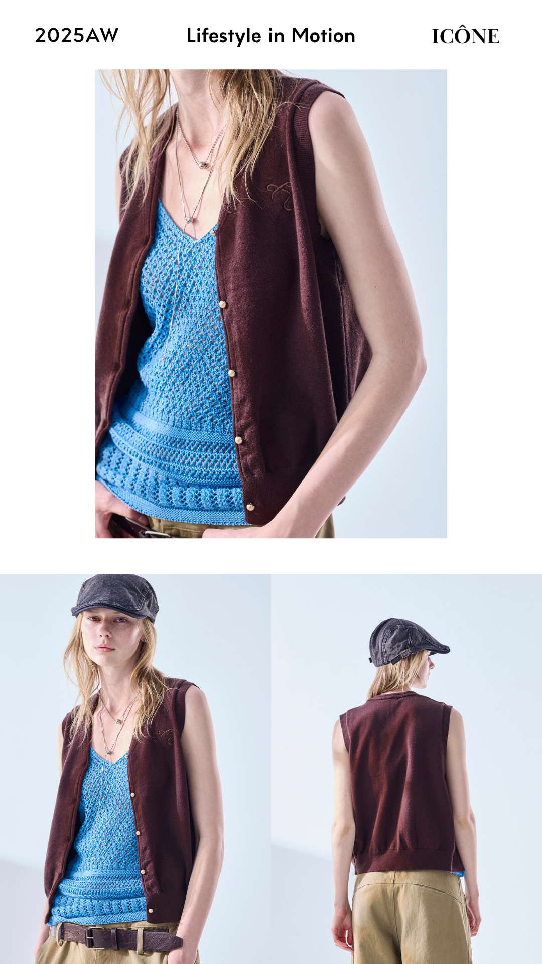 針織背心,讓層次更乾淨。