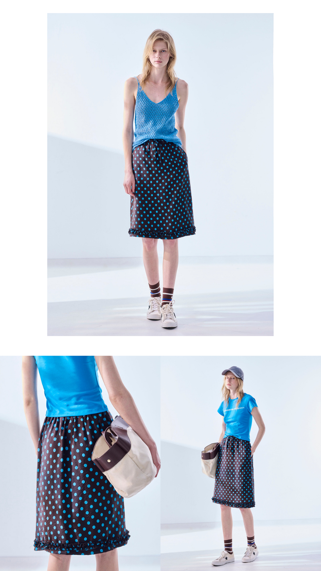 印花設計為短裙增加活潑感,布料輕盈垂墜。搭配簡單T恤或針織上衣,輕鬆春季造型。