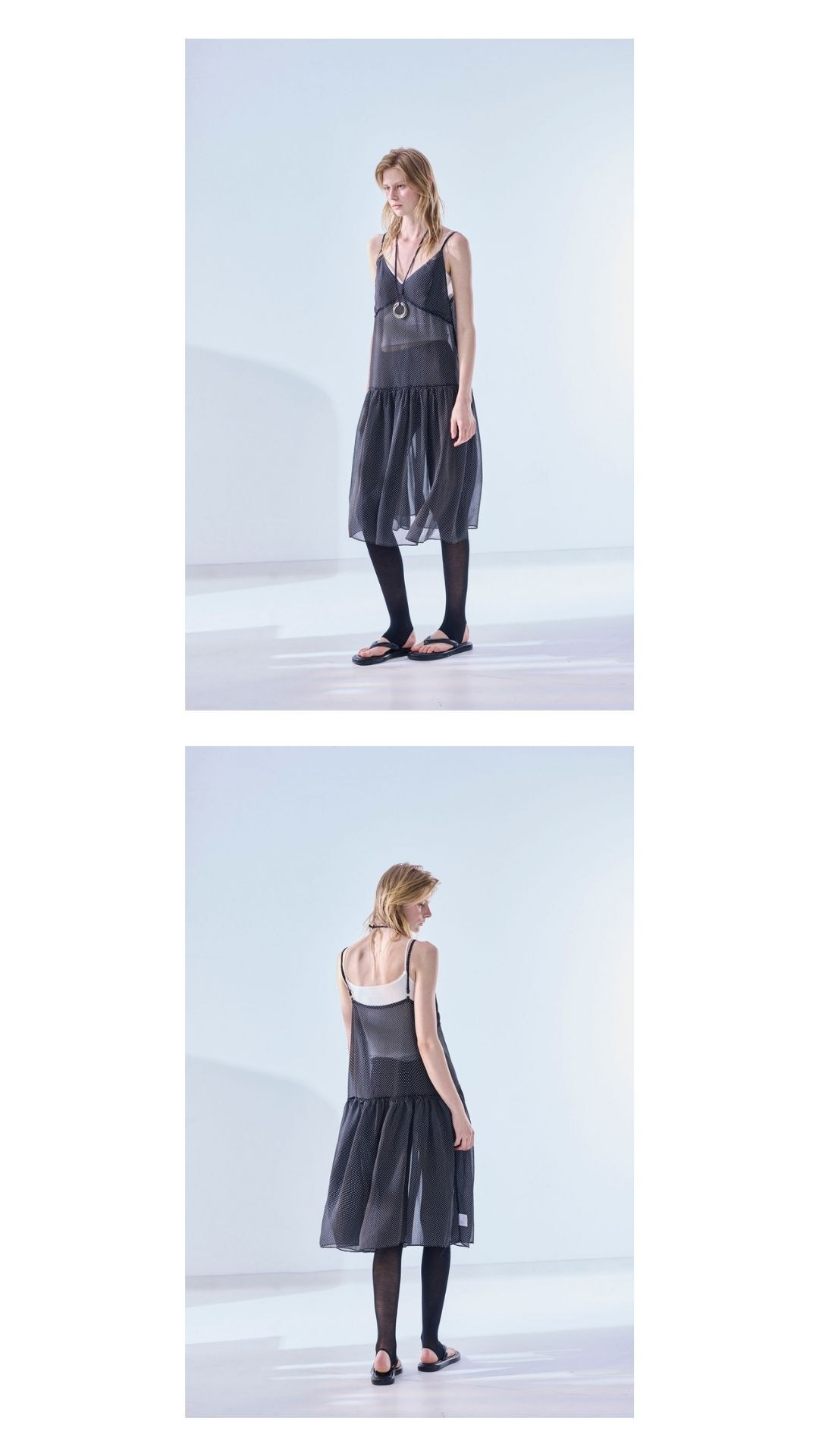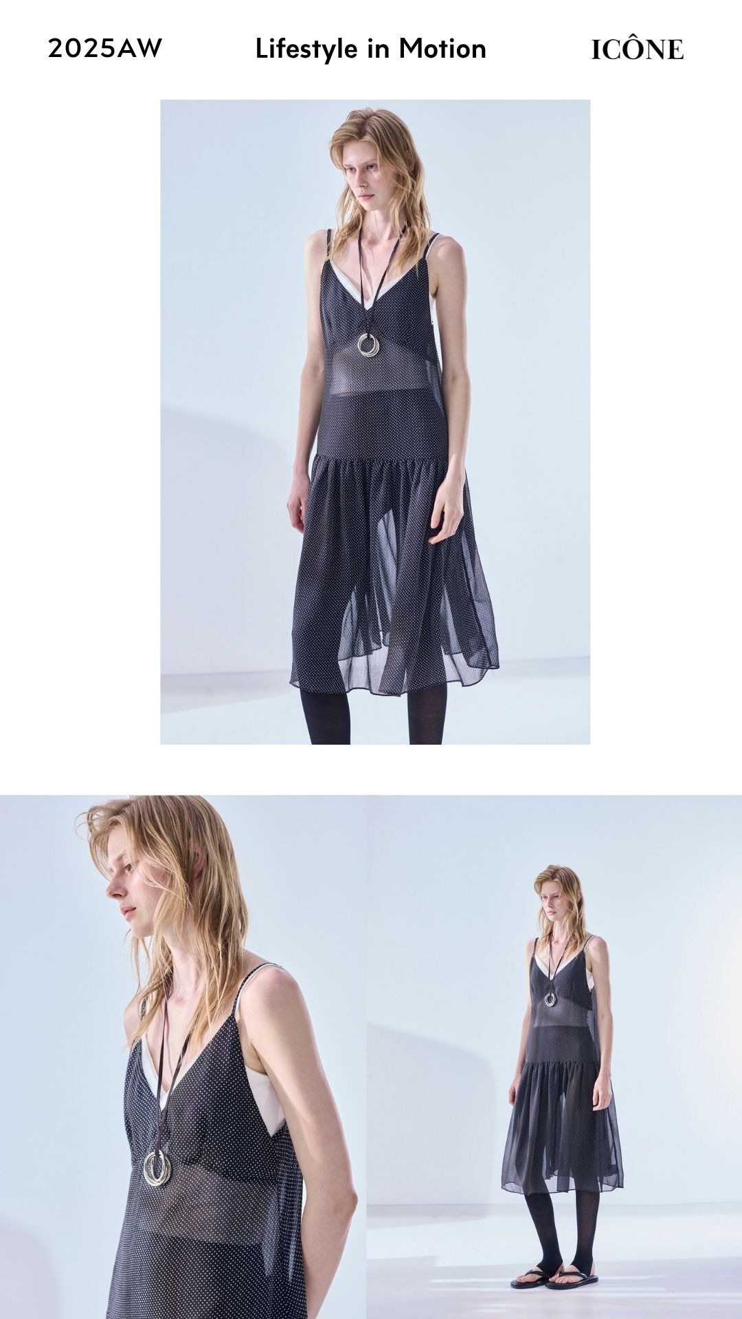 *細肩帶設計,搭配小波點雪紗裙身,輕透柔和,走動間自然飄逸